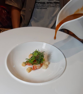 舀一下,質地濃稠,龍蝦的香氣瀰漫,用麵包蘸點就更可口,加上幾塊龍蝦肉,好味。